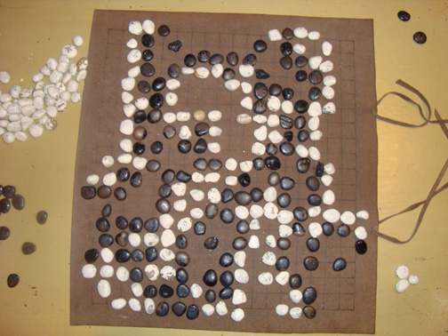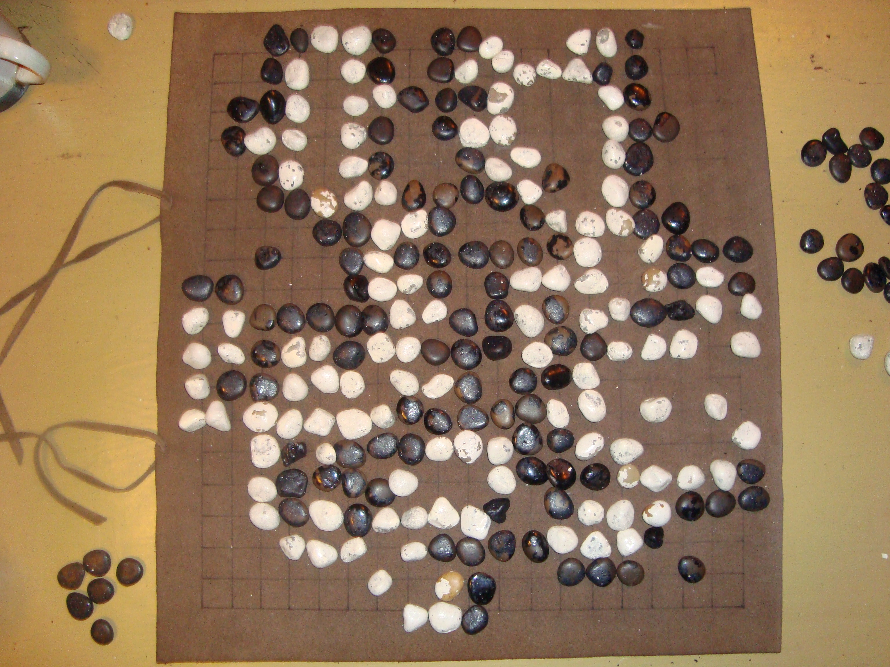 The game is all about playing stones on intersections of a 19X19 line grid (the world), trying to surround more territory than your opponent, who is trying to do the same, leading to complex battles. There are only a few rules but it is a difficult game to master. This particular board is leather and the strings are there to tie it up once it’s rolled up after use.