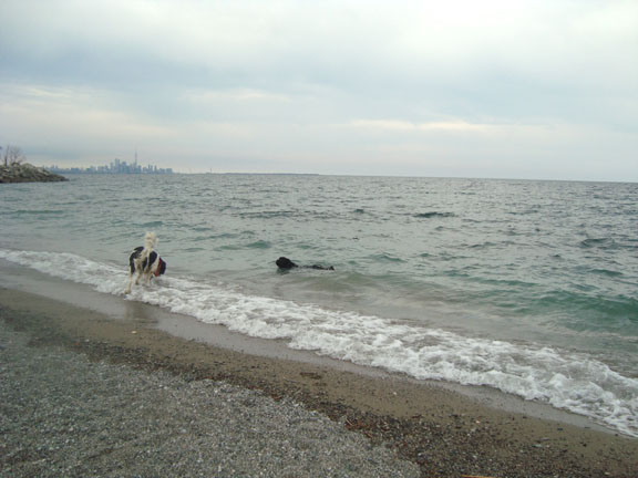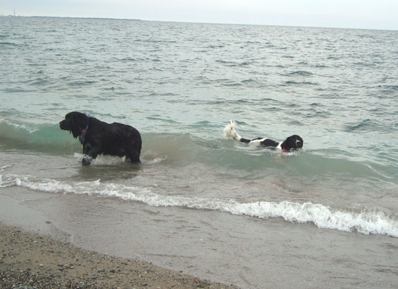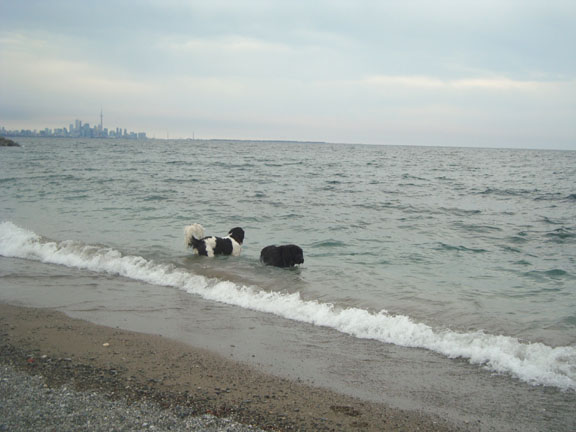 So cute. Their colours of fur look so beautiful against the blue water. Gee, M. Ellie May gets right on into the lake huh?
