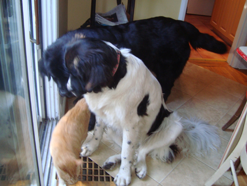 That is so sweet! 200 pounds of dogs deferring to a 5 pound cat.