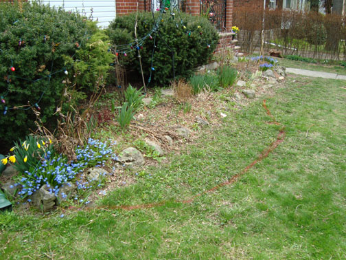 Those who know us, and especially those who visited the previous Anchovy World Headquarters, know that lawn is a temporary condition, a place-holder until the gardens go in. You can see the immediate plans for the front yard in these photos. Extending the garden along the house and building one new garden will be the extent of the work for this year. Both new gardens will be raised. Stay tuned in the coming weeks…I’ll post shots later on of these gardens once we get some plant in. Of course a perennial garden takes time to mature and come into its own. That’s part of the fun of it. Each year as it matures it gets more lush and more interesting.