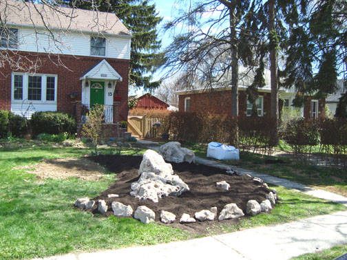 I laid wet newspapers down on the grass then covered the newspapers with enough soil to support plants for this season. The newspapers will kill the grass and if my experience with the garden I did last year in the back is a good indicator, by next season, it will be one big happy garden.