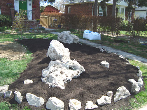 I wish I could say we hauled the rock home in the trunk of the Corolla, but in fact I went to the local rock yard to pick them out and they delivered them. They weigh about 600 lbs each for the big ones.