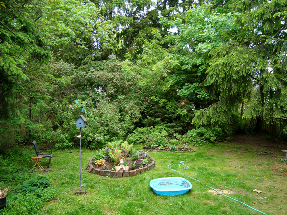 In the jungle back of Anchovy World Headquarters, I carved out the beginnings of some gardens last season. They’re coming along pretty well. I have a plan for another back there, but I’m procrastinating that one a while. The wading pool is for Memphis and Ellie Mae to keep them cool on hot days.