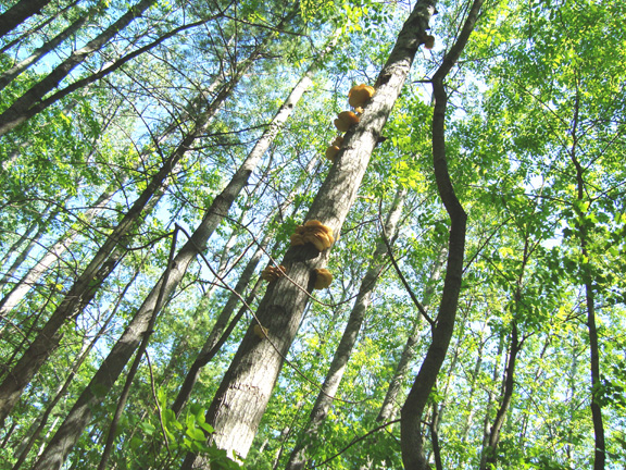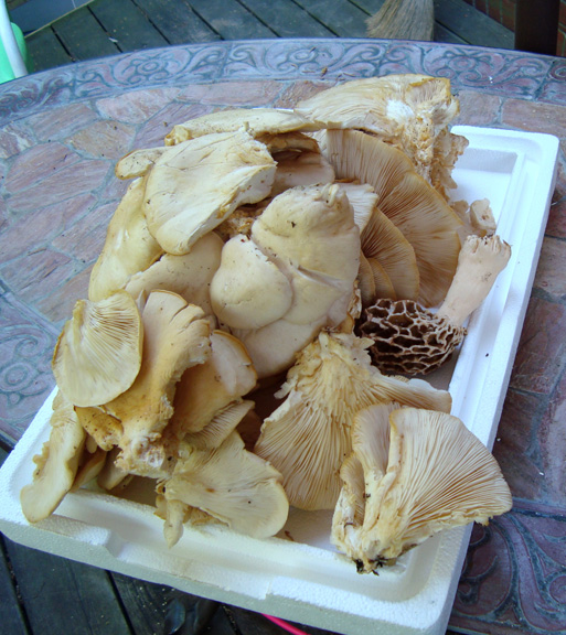 The shot above shows oyster mushrooms on a dead tree in the woods. As you can see, they’re pretty high up. I found a long sapling on the forest floor and used it to knock some of them down. I only found three trees with fresh oysters today, but you get quite a bounty from each tree…if you can reach the treasure.