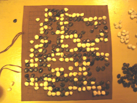 I played 5 games of Go with Vox last night. In the game pictured, the first of the night, he won handily with white. I got my licks in too, though, winning two of the 5 games. Last night’s games were scrappy and there were some significant kills involved.