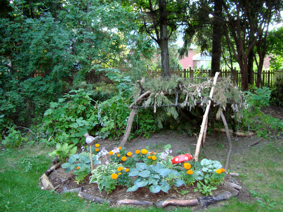 The back garden has been growing and filling in nicely. I’m really enjoying what’s going on there. I planted several catnip plants in this garden, courtesy of Salvelinas, and they have taken root and started growing like mad before the cats could do much damage to them. The cats like to hide in the garden tucked in among the catnip. This garden is going to get a little more sun now that I’ve taken out a Manitoba Maple or Box Elder or whatever name you want to give to this fast growing weed tree. Fortunately, it was still much smaller than the 30 cm diameter that triggers a need for a permit from the city to remove it.