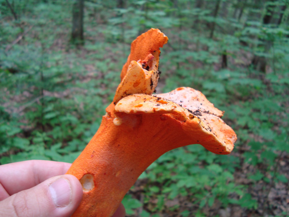 Some people I know won’t eat lobster mushrooms. These fungi are Hypomyces lactifluorum, basically a red-orange cup fungus that has attacked a host. The host is usually considered to be either Russula brevipes or Lactarius piperatus. The problem is that the host often gets distorted and so cannot be so easily identified and some people are worried that the Hypomyces can attack a poisonous host.