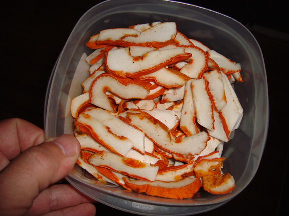 These mushrooms can be a little difficult to clean. Sometimes slugs get in them, and they get very dirty, and parts of them may have wormholes or otherwise not look so appetizing. The first thing to note is that there is no problem cleaning these under a jet of water, so that’s the first thing I do. After that, simply slice them into thin slices, and cut away anything that isn’t red-orange, white or firm. Anything that has turned deep red will also have turned spongy. The phot shows a basket of lobsters that has been prepared for drying.