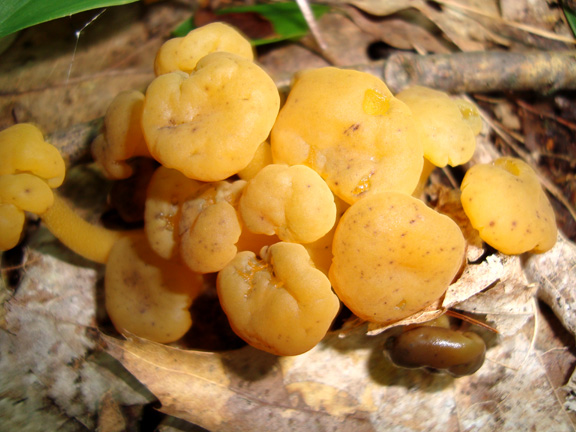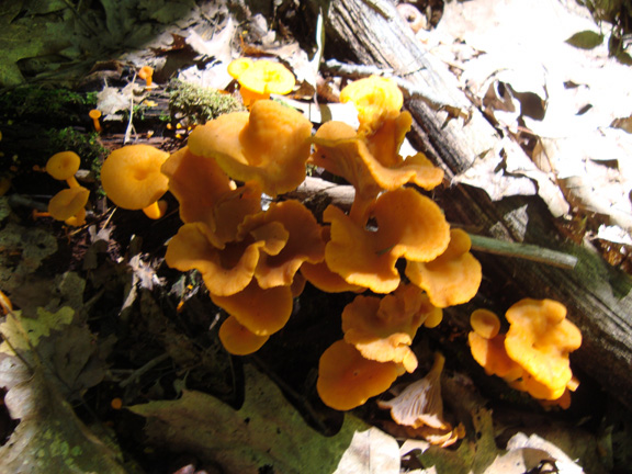 I think the mushrooms in the lower photo are Omphalotus olearius, known as the False Chanterelle. The gills and the colour look quite a bit like chanterelles but they are growing in a batch, growing on wood, and they are light and hollow, unlike chanterelles, which are chunky. I wonder if the group in the top photo are the same kind of mushrooms only much younger? I’m thinking this could be now that I’m reviewing my photos, but I didn’t make the association at the time, in part because I found these clusters hours apart in different tracts of forest.