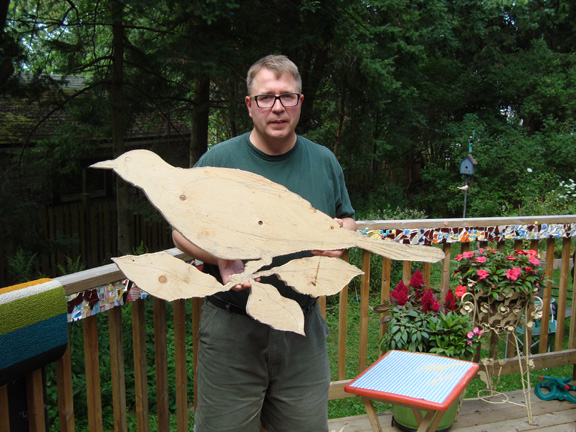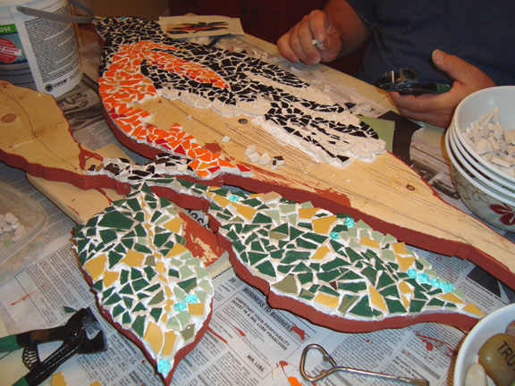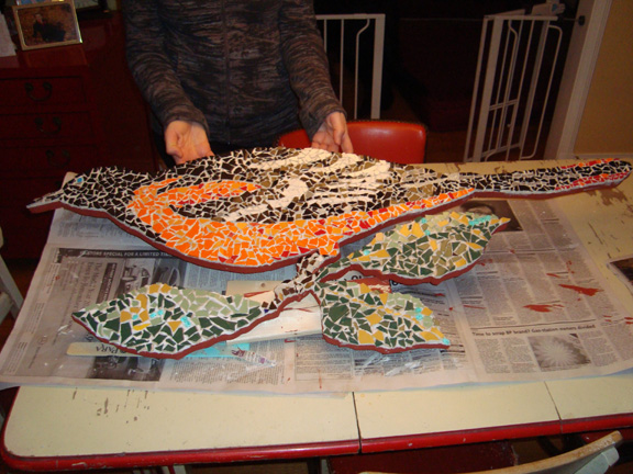 We’ve been working on a mosaic we plan to mount on the brick face of Anchovy World Headquarters. This is the prototype. The next one will be much larger. This one is a Baltimore Oriole, also known as a Northern Oriole. Here’s a series of photos showing some of the process. We finished it off tonight and we’re going to put it up on the weekend. Maybe the next one will be a huge barred owl….