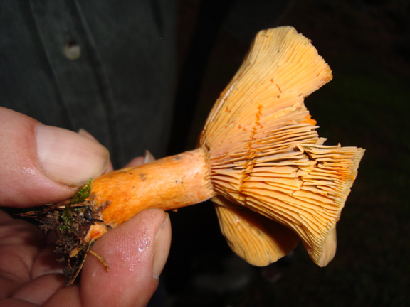 UPDATE: Salvelinas says it is likely not Lactarius deliciosus because the mushroom we found doesn’t stain green. He suggests it is more likely Lactarius thyinos, also an edible.