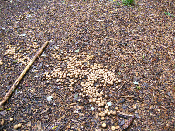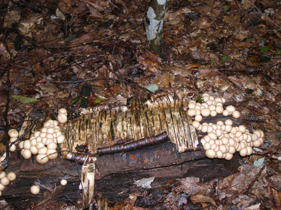 I observed many puffballs on my trip. There are several varieties of small puffballs in our area, and I’m not an expert on telling them apart but my best assessment is that I saw Lycoperdon pyriforme – the Pear-shaped Puffball; and Lycoperdon perlatum – the Gem-Studded Puffball; I may have also observed Scleroderma otrinum – Earthballs. There may have been others.
