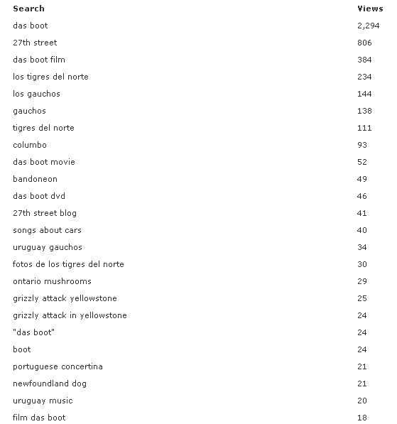 The WordPress interface gives me a view of all the searches which caused folks to land on this little piece of the rock since I closed down the old Mister Anchovy’s on Blogger and started 27th Street here on WordPress. I’ve pasted a picture of the top searches below.