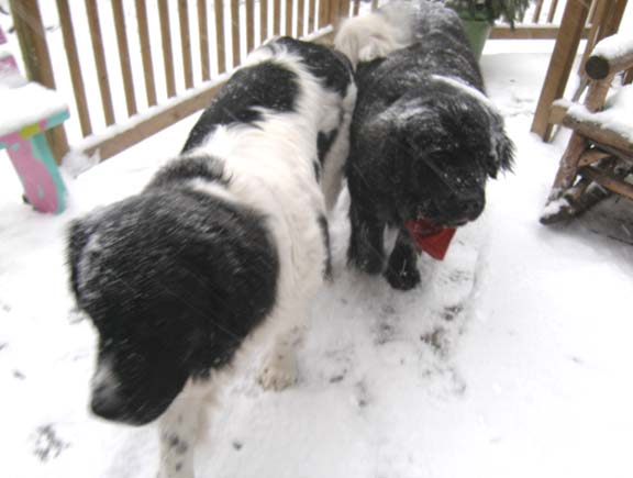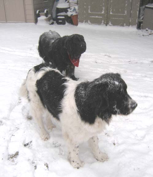 We had a little snowstorm in Anchovy-town this morning. Here are the girls out in the backyard after playing with their buddies at the dog park. It stopped after about five inches of snow fell. Beautiful.