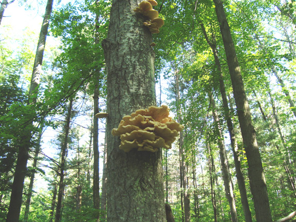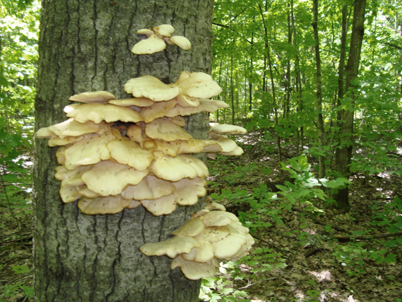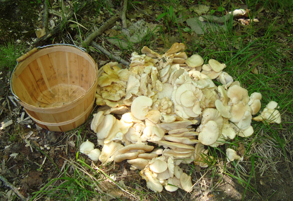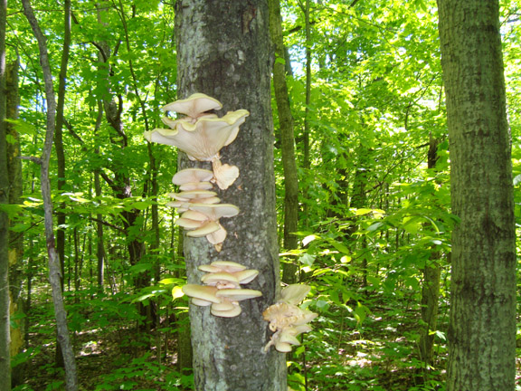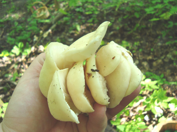 I packed up the dogs this morning and went hunting the oyster mushroom. I believe the mushroom I pick on dead or dying poplar trees this time of year to be Pleurotus populinus, although today I met up with a fellow who told me no that couldn’t be true because Pleurotus populinus isn’t listed in Baron’s guide. He believes the mushrooms are Pleurotus dryinus, but I think they have a suede-like texture and these mushrooms do not. In any case, we can agree to call them oyster mushrooms and we can agree that they grow on dead or dying poplar trees for a brief period this time of year.