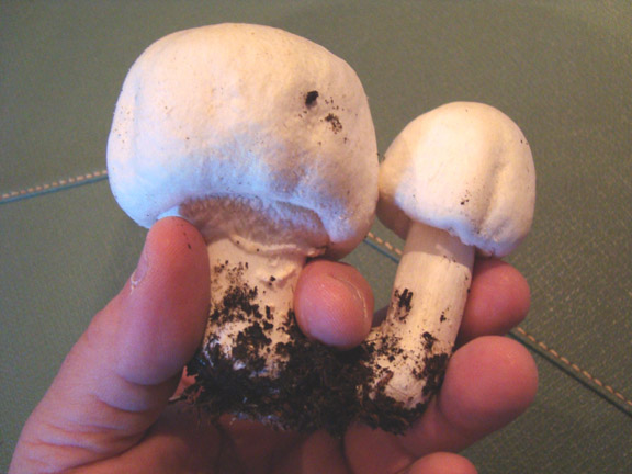 These are young specimens. When mature, the gills are brown. They have a mild pleasant odour, and no vulva at the base of the stem. Attempts to bruise or rub or cut or scrape the cap or stem do not result in any staining at all.