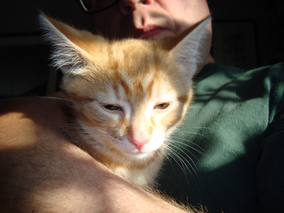 Regular readers of this blog know that we recently adopted a red kitten, little Davey, who we lost from pneumonia after he only lived with us for a month. Tuffy P. decided we needed another red kitten. Nothing else would do. The other day, she came home with a little rescue kitten. The mom lived in a ferel cat colony and apparently deposited her kittens on someone’s porch.