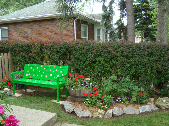 This garden was created by Tuffy P. It’s right at the front entrance to our house. The bench was a gift from some great friends several years ago. It used to have a natural wood finish but after several years on our front porch back at the old house, it needed revitalizing. Tuffy has just given it a new paint job. Her idea was to flank the bench with a garden on each side, a small one to the rear, and a larger one toward the street.