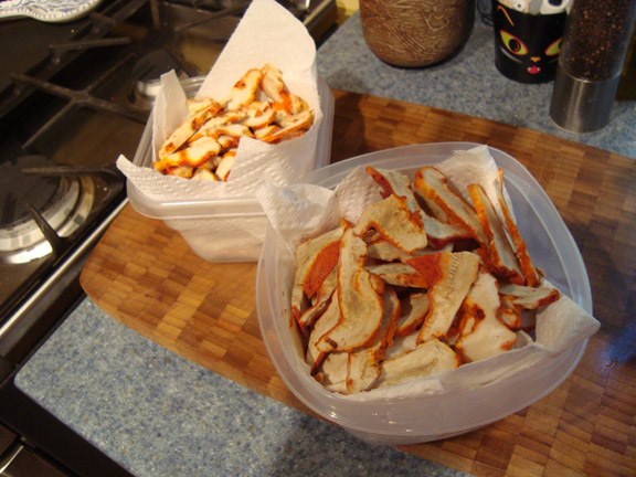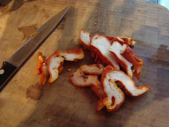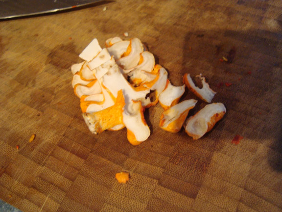 The first thing I do is wash the outside of the lobster with a spray of water. These fungi are very firm and will not suffer any difficulties from a thorough washing. Then I slice slice them into fairly thin slices, usually about an eighth inch thick. In the picture above, you can see some dark brown spots in the flesh. Some kind of bug had a leasing/buffet arrangement going on. No problem. Just cut out anything that you don’t like the look of. That’s a fairly broad and subjective statement and to be sure some people will fuss over lobster mushrooms more than others. I cut away any punky areas and anything dark brown. Ideally, what you want to be left with is either red or white.
