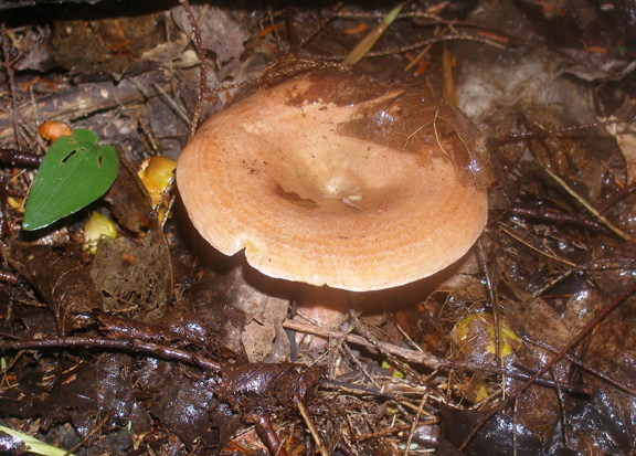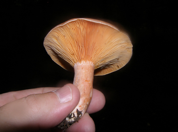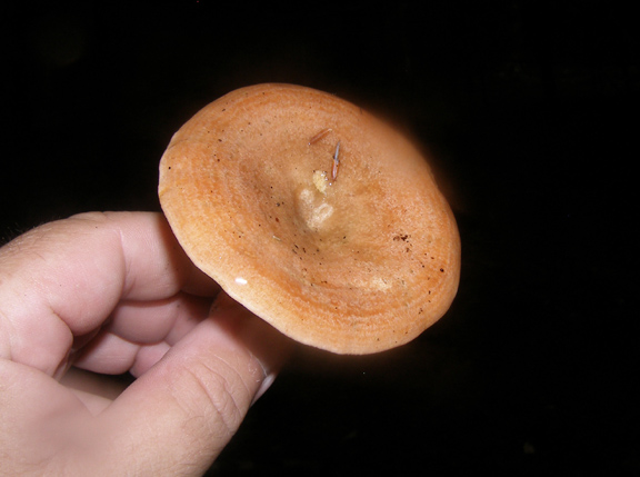 I found just one of these mushrooms today. I believe it is likely Lactarius deliciosus, known as the saffron milk cap. When I saw it, I thought it might by L. thyinos because I couldn’t see any staining. However, this mushroom did stain when handled. Last year, I collected a number of L. thyinos, which were a brighter orange with very bright orange milk. Both are edible but L. thyinos is better. Still, good to know there are milk caps in this forest.