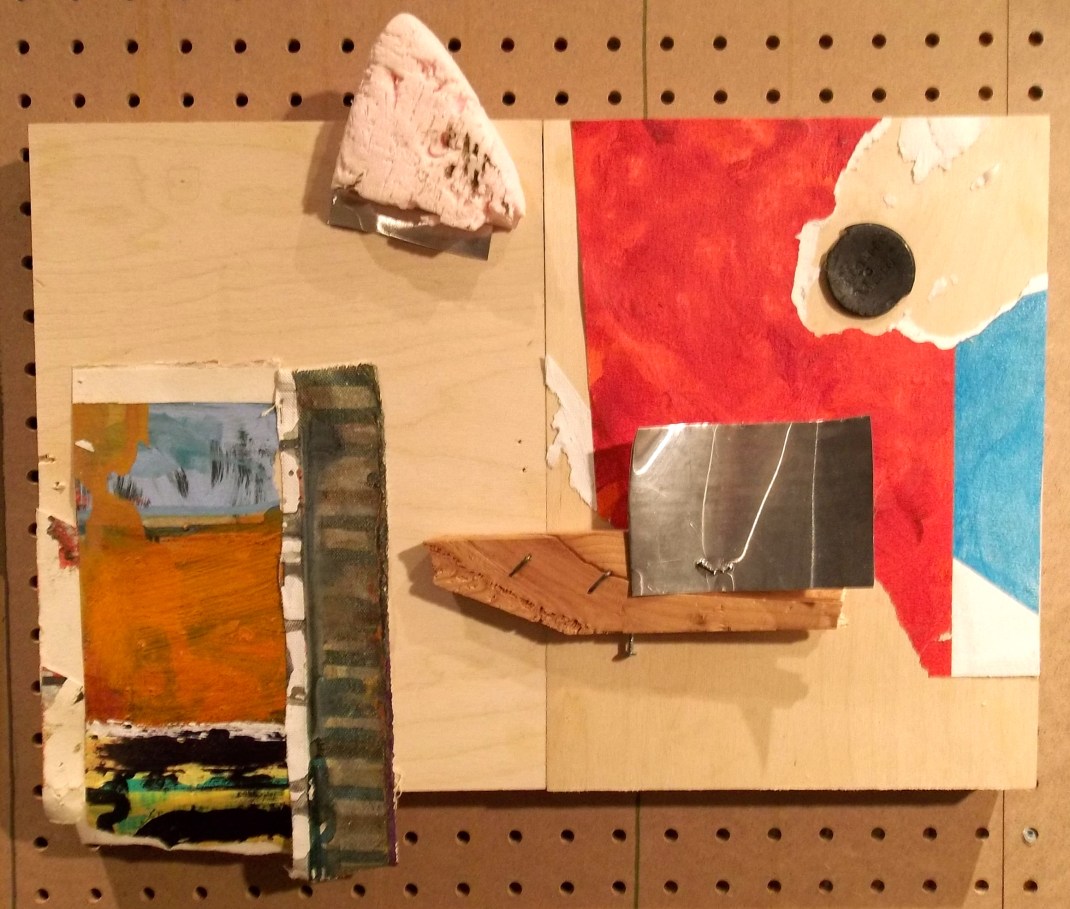 I’ve been messing about with some little constructions. I’ve been thinking of them as doodles or sketches in a way, breaking down old patterns and ways of looking at things more than anything else. I don’t know where they’ll take me, if they take me anywhere at all. This one is Maiden Voyage. A broken stick and piece of old sheet metal my Santa Maria, part of an old painting now a gateway to a new world. But danger lurks. Iceberg off the starboard bow. Haha.
