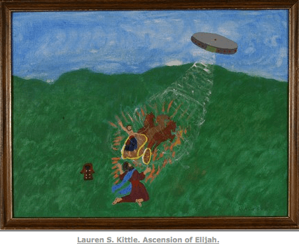 We enjoyed following the Slotin Folk Art auction on-line over the weekend. We even bought a bit of art for Anchovy World Headquarters, including Ascension of Elijah, pictured below, by Lauren S. Kittle.