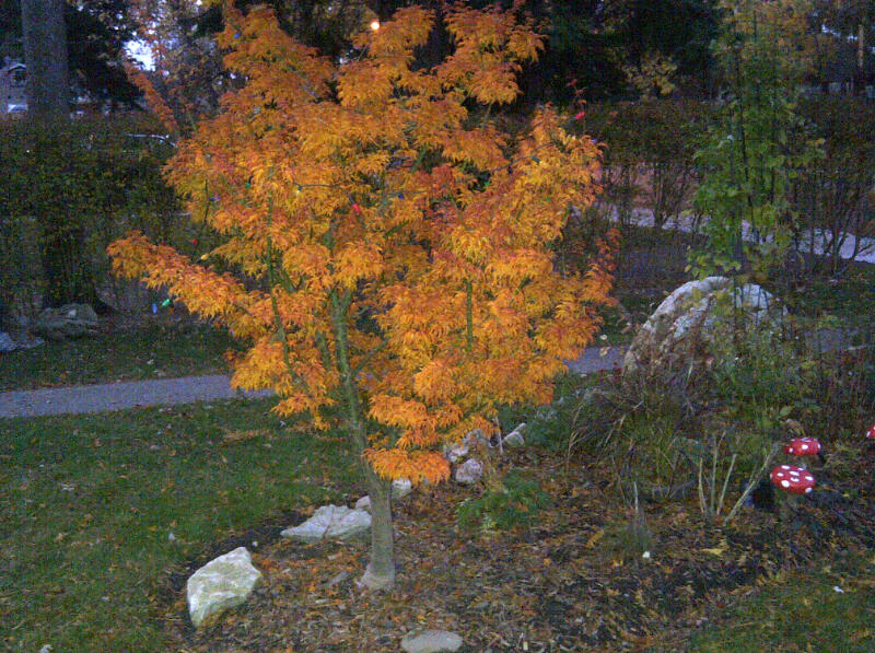 We planted our Shishigashira or Lion’s Head Japanese Maple the year we moved in to our house. It’s a slow-growing variety with distinctive deeply cut deep green leaves that stay that way well into the fall. In our area, most trees are well past their peak colour while our Shishigashira is showing off.