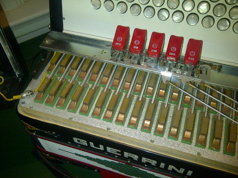 The picture shows the accordion without the grill. The left side is the bottom of the accordion when playing. The yellow wire you can see along that side connects from an internal mic to a control on the outside of the accordion. That wire sits there under the grill in a space next to the valves. Somehow, the wire slipped under one of the pads. When I opened up the grill, I could see the wire holding up the pad, allowing air to pass. Normally, gravity keeps the wire away from the pad. I must have depressed a button with the accordion upside down, causing gravity to have the reverse effect, lodging the wire where it didn’t belong.