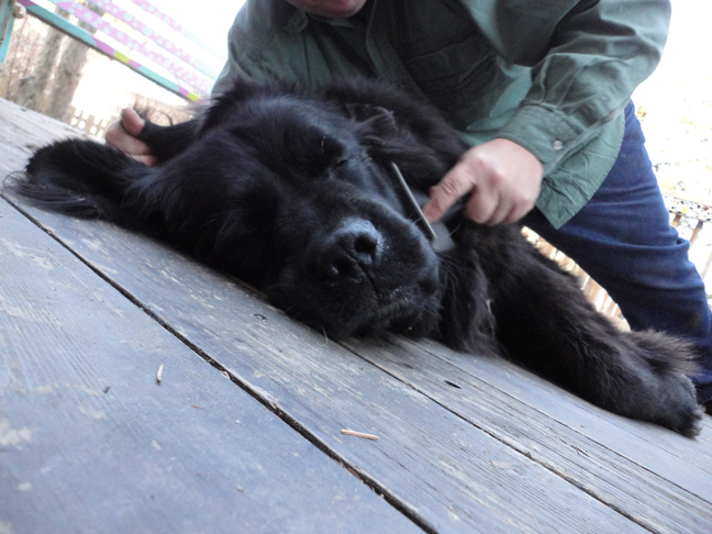 Ellie Mae believes in conserving energy at every opportunity. So, when I try to groom her, she immediately falls asleep, allowing me to do one side, roll her on her back to do her belly and roll her on her other side to finish the job.