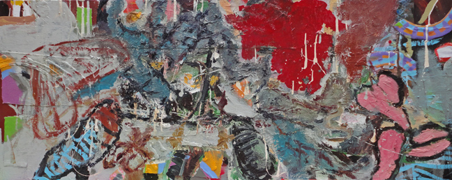 I painted Ephemerata in the winter of 2001/2002, one of many paintings I created during what I can only call a ferocious flurry of painterly activity that winter. I made a lot of paintings in a remarkably short period of time. In fact this was the most prolific period of my painting life. I exhibited this painting, along with a number of others in the series at Loop Gallery. This one is about three feet wide. This painting contains some collage taken from some older paintings and is painted with oil and some industrial paints on canvas. Ephemerata is being adopted into a loving home where it will get the care and feeding it deserves.