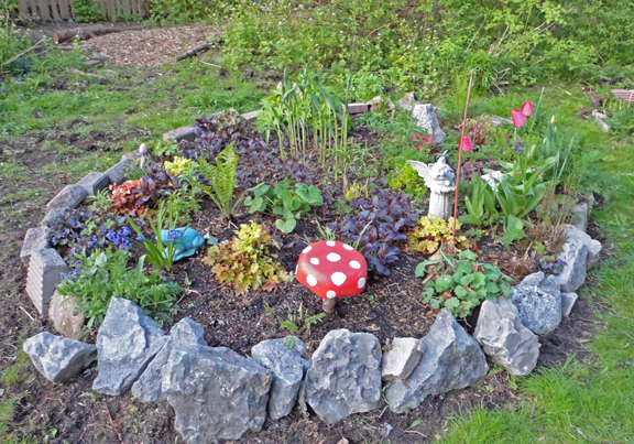 Tuffy P cleaned up the back perennial garden today, taking out weeds and old dead plant matter. This garden will start looking really good in about a month. Some of you may be wondering about the red and white item in the foreground. That’s an early speciman of Amanita chipbowlius. These fungi grow all over the gardens at Anchovy World Headquarters.