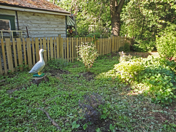 On the walk with the dogs, Tuffy happened to talk to another woman walking her dog and this woman said, we need to cross the street, there’s a duck nesting over there. It’s sitting on eggs and we shouldn’t disturb it. Tuffy looked over and there sitting by the curb, out for any scavangers or the garbage guys to haul away, was a large cement bird. She decided right away that we needed to give it a good home. When I looked in the car I decided it was way to big to be a duck, but then again, it was not nearly graceful enough to be a swan. Clearly it’s a snow goose.