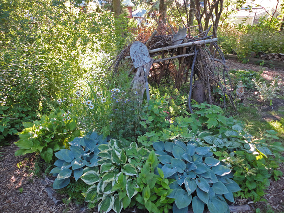 I love the shovel garden, and the beautiful shades of hostas!