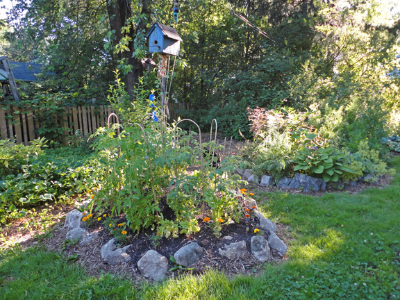 This is a new garden this year. I made it surrounding the bird house, which by the way is still occupied by a family of sparrows. We see them anytime we are not ready with a camera. I have a morning glory growing up the pole, some basil and lettuce and Swiss Chard and a number of tomato plants that were grown from seed and given to me by my friend Spicecat. This garden, like much of my yard has marginal sun for tomatoes, but they’re doing quite well and I expect a fine crop.
