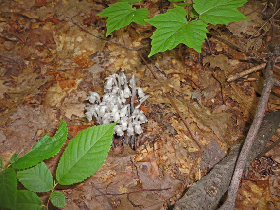 I didn’t see any mushrooms of any sort fruiting in the forest. The only thing I saw of interest was some Monotropa uniflora – known around here as Indian Pipe and also sometimes called the Corpse Plant.