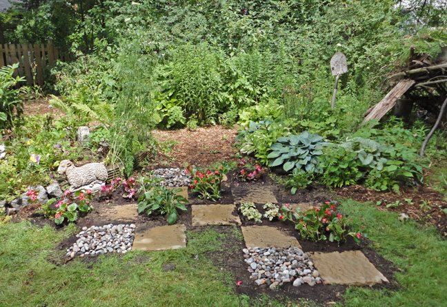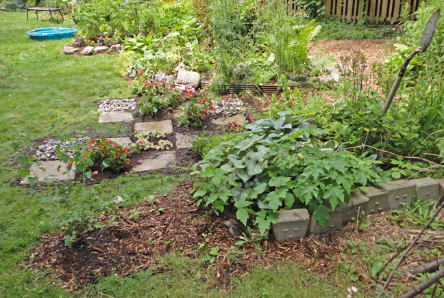 A couple weeks ago I decided to add another new garden out back, this time a checkerboard garden. I finally got around to doing the grunt work today. It’s no great shakes yet – some black-eyed susans and some begonias and some ground cover – but next year, I’ll start thinking about some interesting perennials for the space.