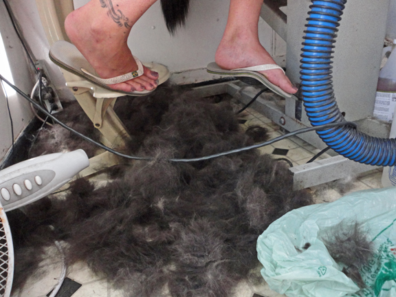 Today Lorraine our most fantastic groomer cleaned up Ellie Mae and Memphis. This involved stripping out loads of underfur, followed by a bath, conditioner and a blow-dry. Most of the hair that comes out when our girls shed is the underfur you see on the ground in these photos. We brush out what we can, but Lorraine gets most of the undercoat out.