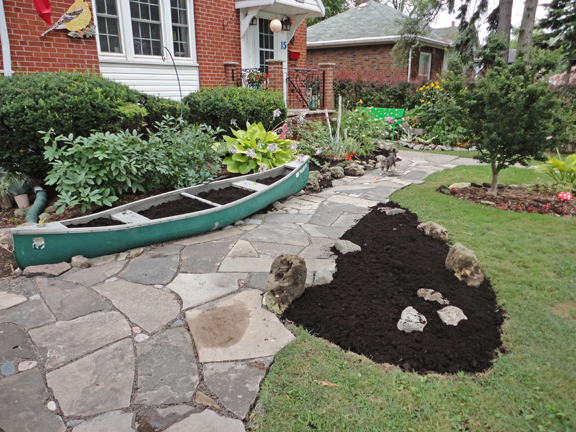 Awww man that garden across from the canoe just screams to be a water element. But if you just have to have dirt think sages. A big honkin mass of sage. Humber Nurseries generally has an excellent selection of different heights and different shades of blue. Hardy, neat, attractive, and disease and bug free. You can work some greenery in among the sages if you like but the effect of a blue garden will really be sharp without looking like a clown’s pants. You will need something a bit low so you dont hide the canoe and sage fits the bill, although the canoe will be plenty visible once you paint it red. Canoes are red arent they?