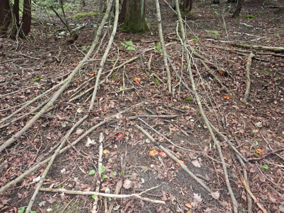 There are at least a dozen lobster mushrooms visible in this shot, which was taken in a hemlock forest. You can see a couple of the specimens are a rosy red while others are more orange. Orange, red-orange or washed out red-orange are all good colours. By the time they get rosy in colour, they are almost always past their expiry date. When you see them in the forest, look for specimens that are firm. Don’t worry if there are a couple holes in the mushroom.