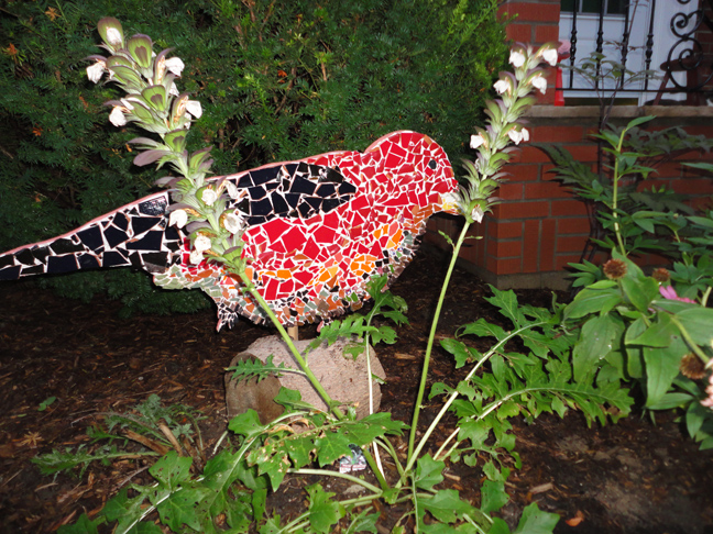 I like the latest bird mosaic sitting in the garden behind the bear’s breeches because you don’t see it right away when you walk into the gardens. Eventually, those bear’s breeches will expand. We’ve seen them with many spikes. When that happens, the scarlet tanager will fly out of the garden, circle around and look for a new place to perch.
