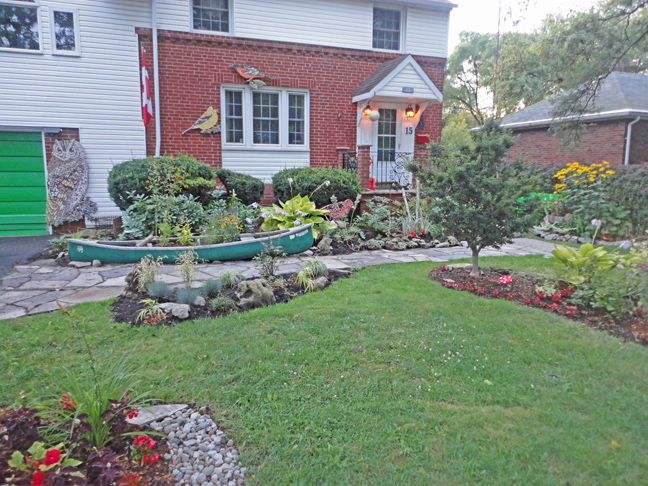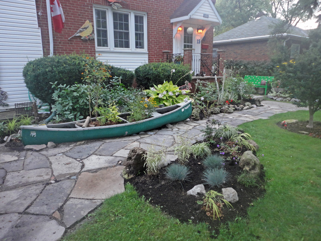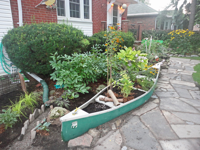 I suppose a front yard canoe garden will seem unusual to some folks but it’s no more unusual than having a six foot tall mosaic owl stuck to the front of the house.
