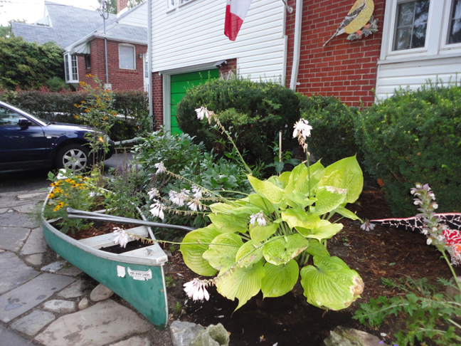 The giant lime-green hosta from another planet is such a striking element in the garden, it seems to explode over the bow of the canoe. You can see the paddles, which came with the canoe, lying against the canoe. That’s temporary. We haven’t decided how we’re going to use them yet. The folks who sold us the canoe commented that we can’t go canoeing without paddles. I neglected to tell them that this canoe would never float again.