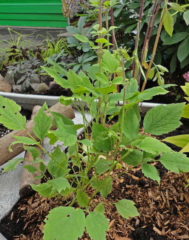 Clematis heracleifolia “Cassandra” is a shrubby, easy to grow clematis – not a climber. It can bloom through the summer and into fall, and it is apparently very fragrant in bloom. We bought one of these (in bud) at Lost Horizons and planted it in the canoe. This plant can handle part shade to sun. Where it is in the canoe, it gets more sun that you might expect between the house and the locust tree. Very close to this location, peonies and poppies have done very well.
