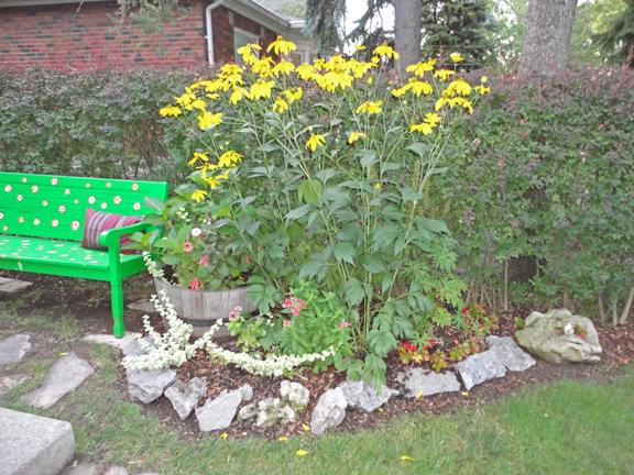 As you walk up the path to the house, you’re greeted by this little garden, and then the green bench, which faces the stairs up to the front door. This garden is really happy this year!