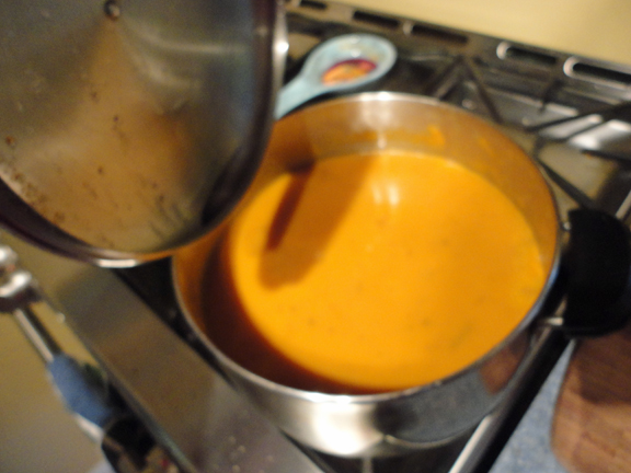 Take the roasted squash et al out of the oven and add it to a soup pot. Pull the rosemary leaves off the stem and discard the stem. Add some dried thyme and some stock. I didn’t measure any of this but today I used about 1 and a half good sized squash to about about 2 litres of stock. Cook it all together for a few minutes and using an immersion blender, blend until you achieve a nice smooth consistency.
