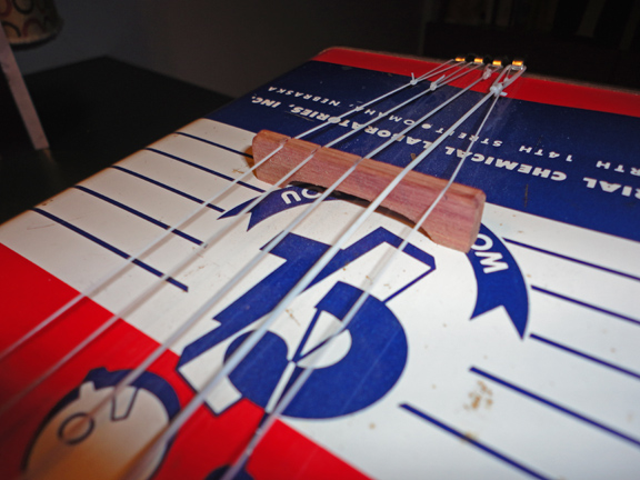I’ve been making some adjustments to the “Industrial” oil can banjo. It was bothering me that the volume on this banjo was lower than I wanted or expected. There are several factors that could affect the sound from the construction and weight of the can itself to the bridge to the nut, or the strings.