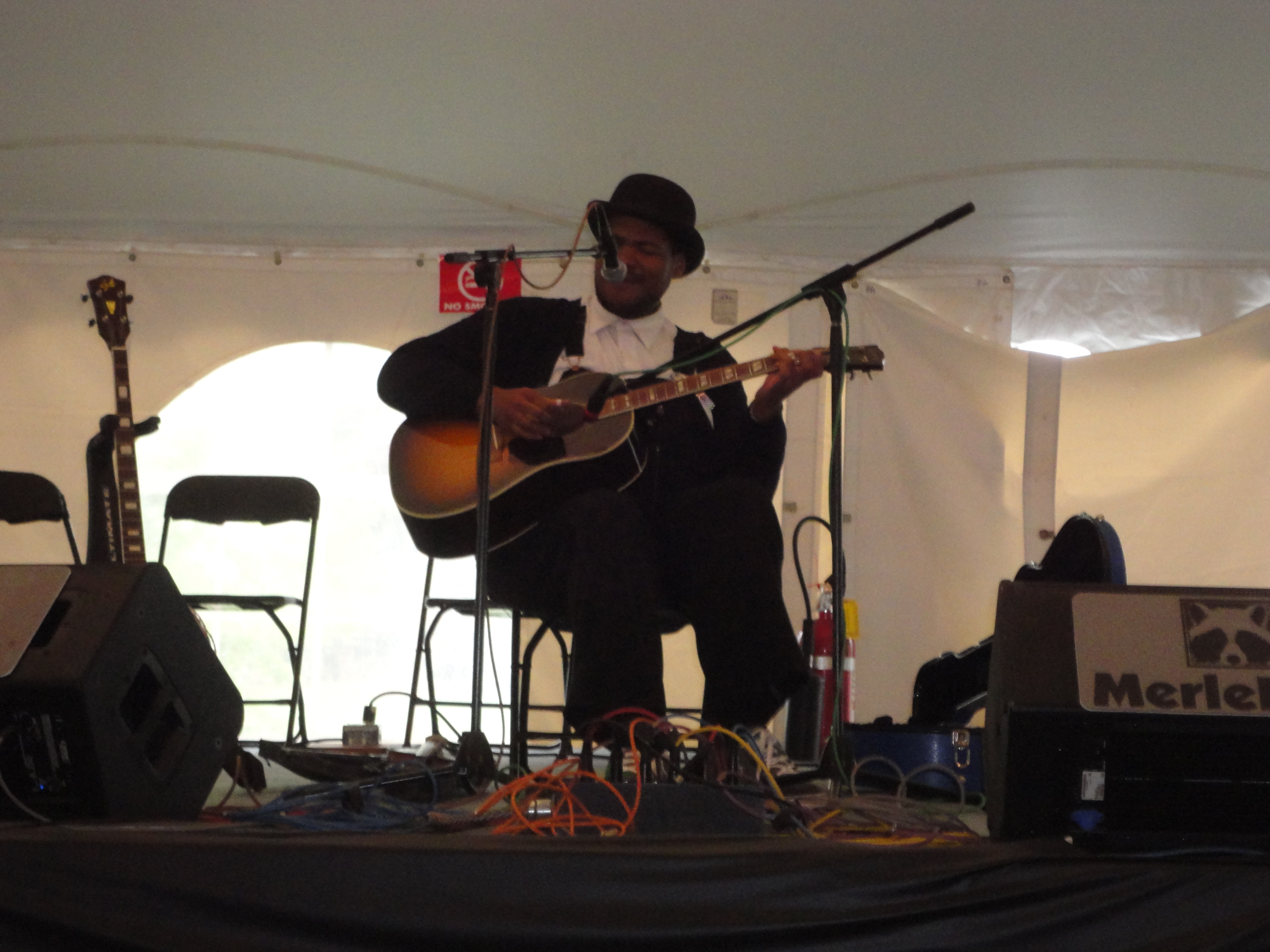 Who is this guy? He was billed at Merlefest 2013 as Blind Boy Paxton but I’ve read he doesn’t like to called Blind Boy anymore. He dresses in a most peculiar manner as you can see in the photo. When he speaks it’s with a Louisiana accent, but I read he comes from LA and lives in NYC. At Merlefest he made a comment about Baton Rouge being considered north where he comes from. And then he mentioned he was Jewish. His set was billed as African-American Old Time music, but he shrugged that off commenting that he was American but the rest of it was up for debate. I really had no idea what to expect from this character – that is until I heard him play. Jerron Paxton is in his mid-20s but he is highly accomplished on fiddle, guitar and banjo and is an extraordinary songster. Don’t worry about the schtick, the outfit, the accent, don’t worry about any of that. Just listen to this guy play! Here he is performing Casey Jones at Merlefest 2013 at the Traditional stage, channeling the late Furry Lewis. Sorry about the bad video quality. At least it gives you a little taste.