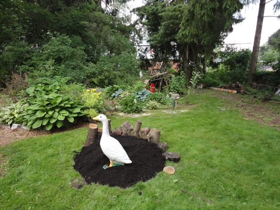 I don’t know what came over me….I wasn’t planning on cutting a new garden this summer. I did have some soil on hand though, and while I was out in the back yard, I found myself visualizing the new garden, a modest circle. I cut out the grass and some roots and I dug it up and added in some fresh soil and made a border…..and then Mrs Goose flew over for a look.