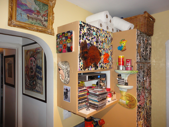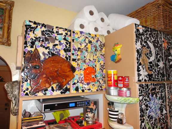 She’s added a bunny and an orange mushroom and more mosaics to another pair of cupboards.