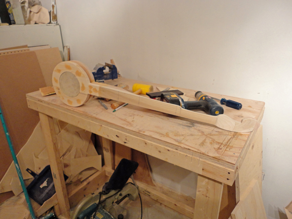 DSC04567The core components of the mountain banjo I’m making are now assembled. Fitting and stretching the goatskin was a bit of a challenge. I wanted a snug fit and my hole was a smidge tight, causing me some grief. Also, I used a piece of stove-pipe that snaps together for stretching the goatskin, and I realize this isn’t quite ideal because it means the rim isn’t consistent all around. Still, I think it will work out OK. I’ve left it to dry and hopefully, the skin will tighten up nicely. There is still plenty of work to do before I can string and play this instrument, but it’s coming along.